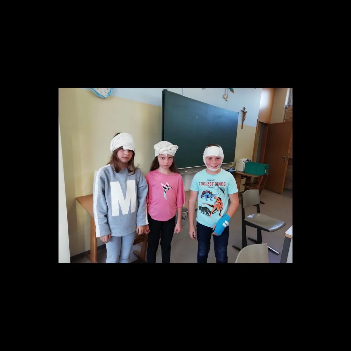 Dabei lernen die Kinder, wie sie sich im Notfall verhalten sollen. Es wurde der Notruf geübt, verschiedene Verbände angelegt, Anzeichen von verschiedenen Erkrankungen aufgezeigt, die stabile Seitenlage erlernt und gegenseitig angewendet und auch Regeln zur Unfallverhütung gelernt. Mit großem Interesse und Begeisterung machten die Kinder bei allen Übungen und Theoriethemen mit. In insgesamt 8 Doppelstunden wurden sie durch eine Erste-Hilfe-Ausbilderin unterrichtet.