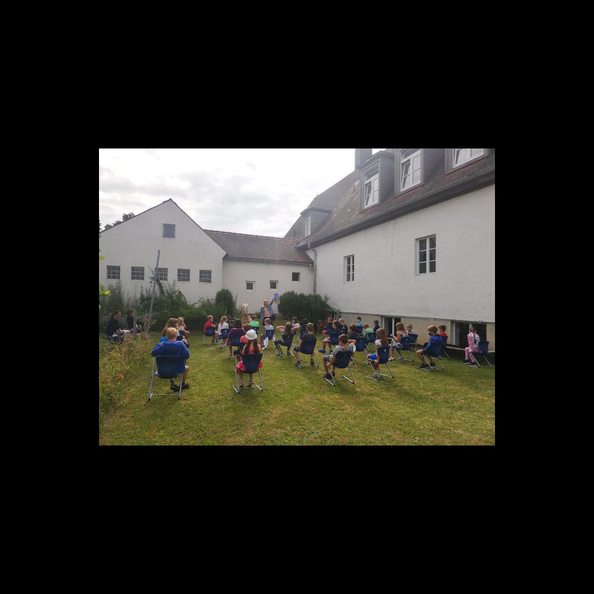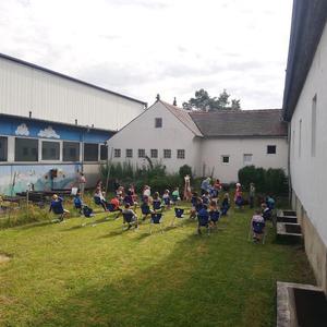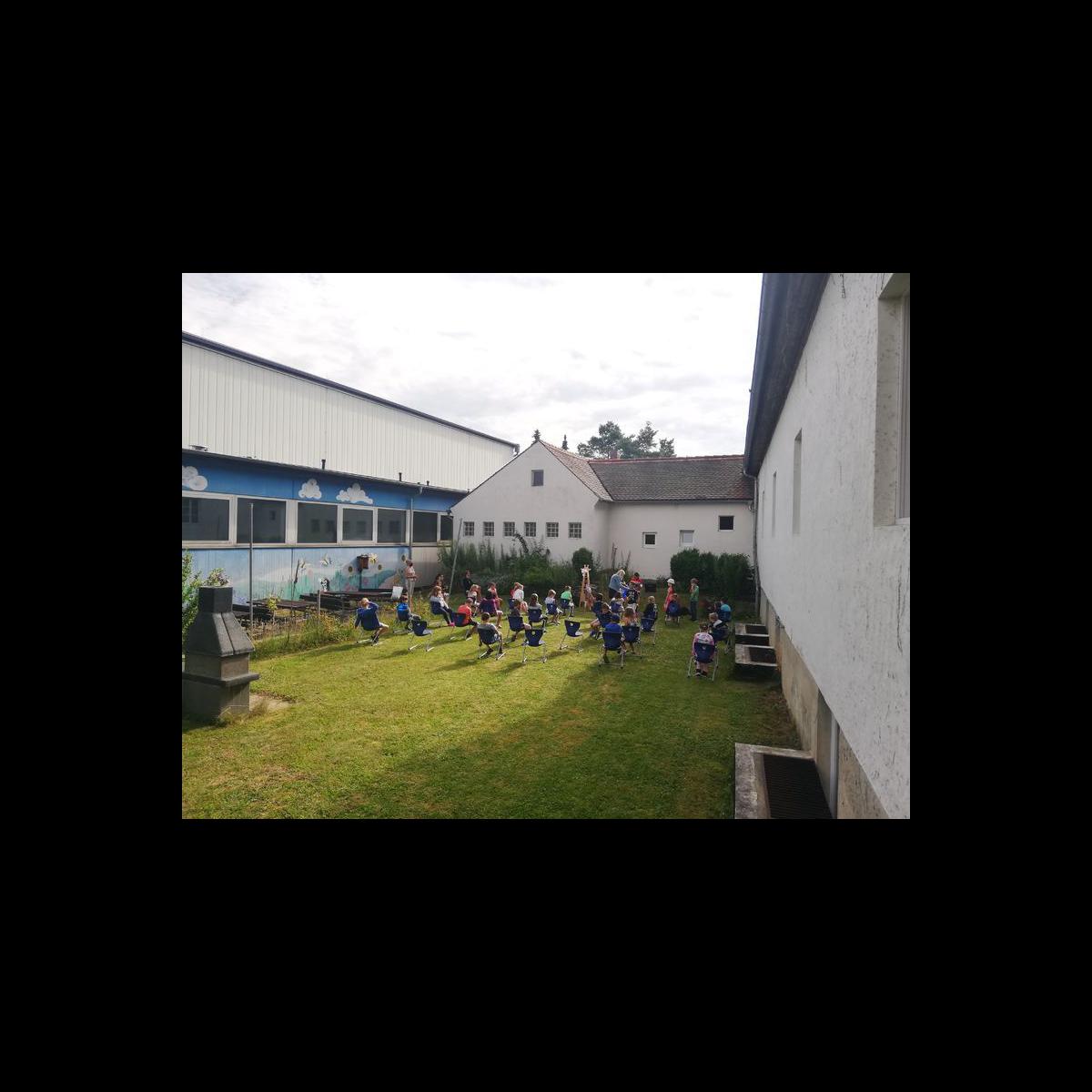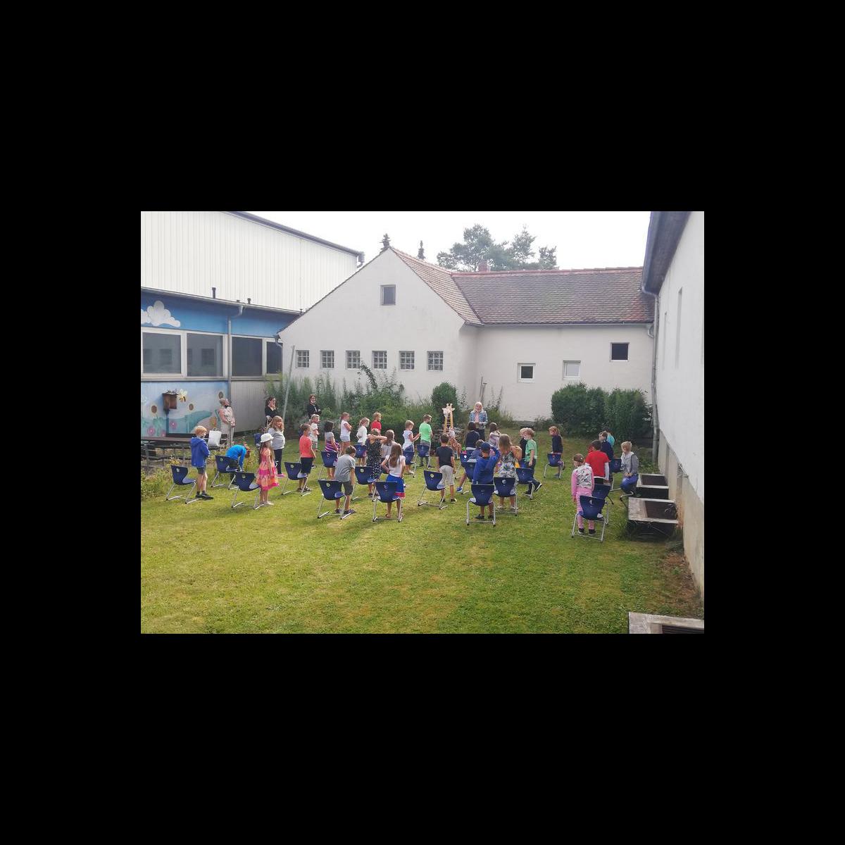 In der Grundschule im Garten hielt Frau Haber-Rulffs bei strahlendem Sonnenschein die Abschlussandacht zuerst für die 3. und 4. Klassen, dann für die 1. und 2. Klassen.