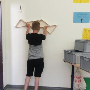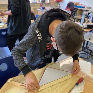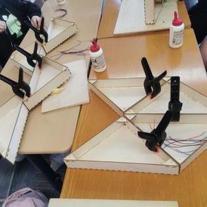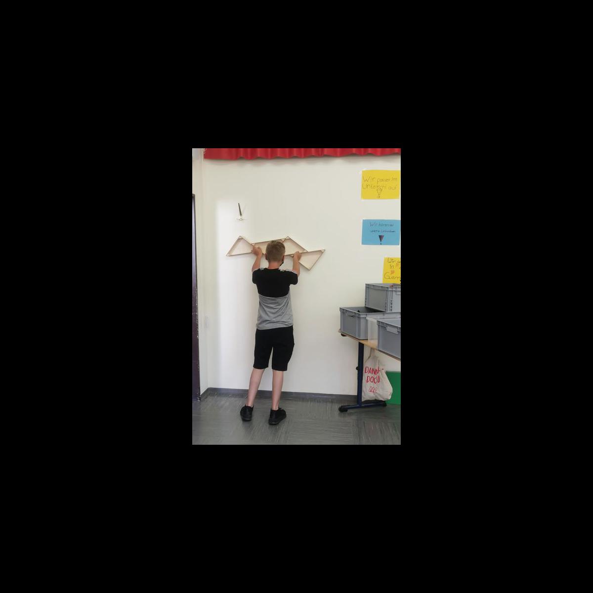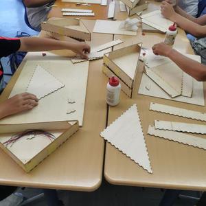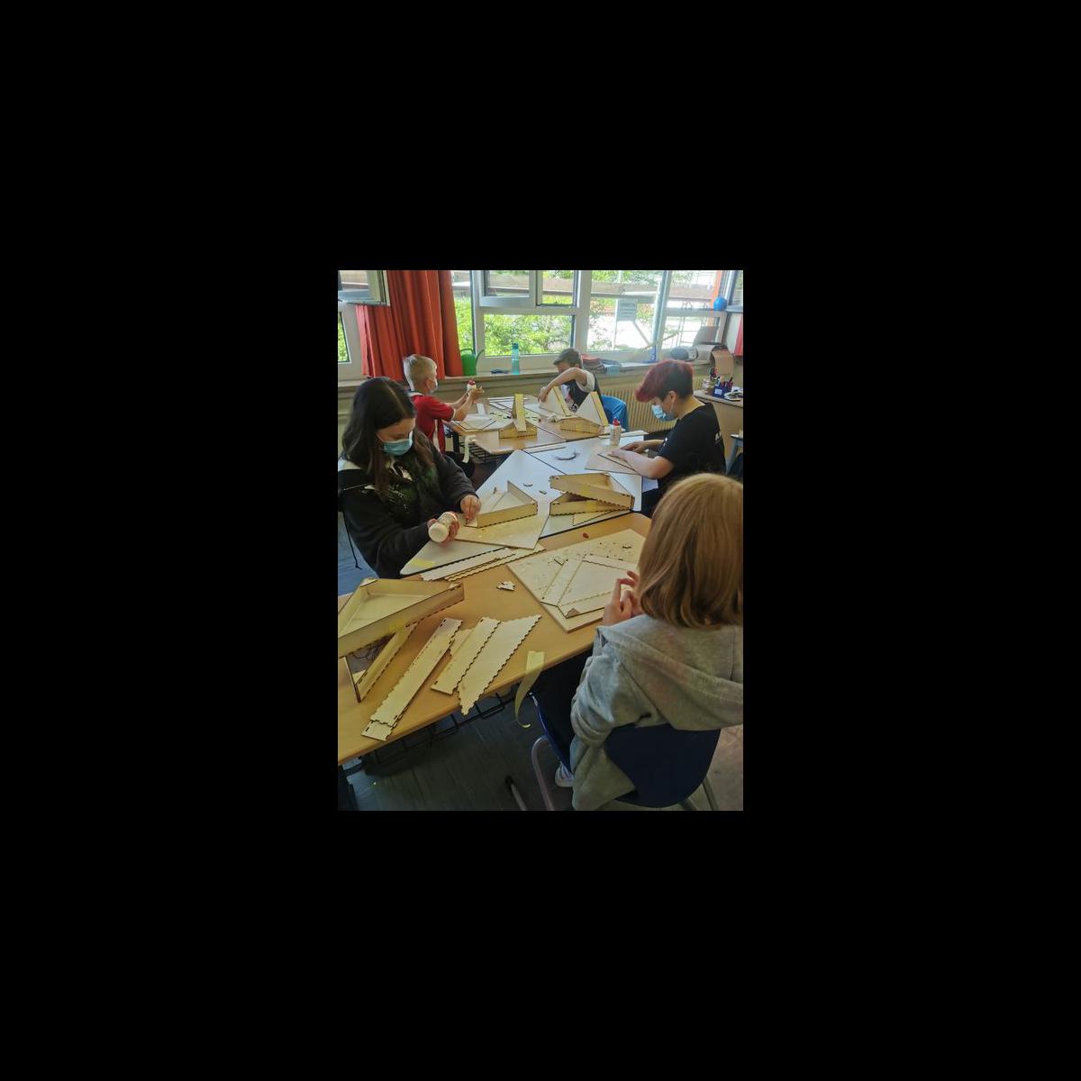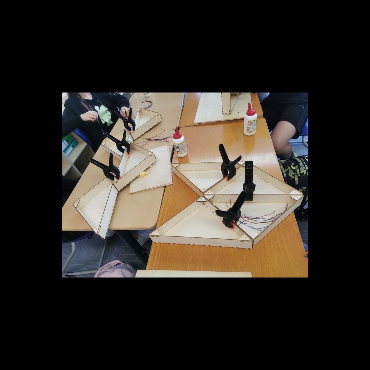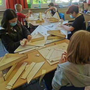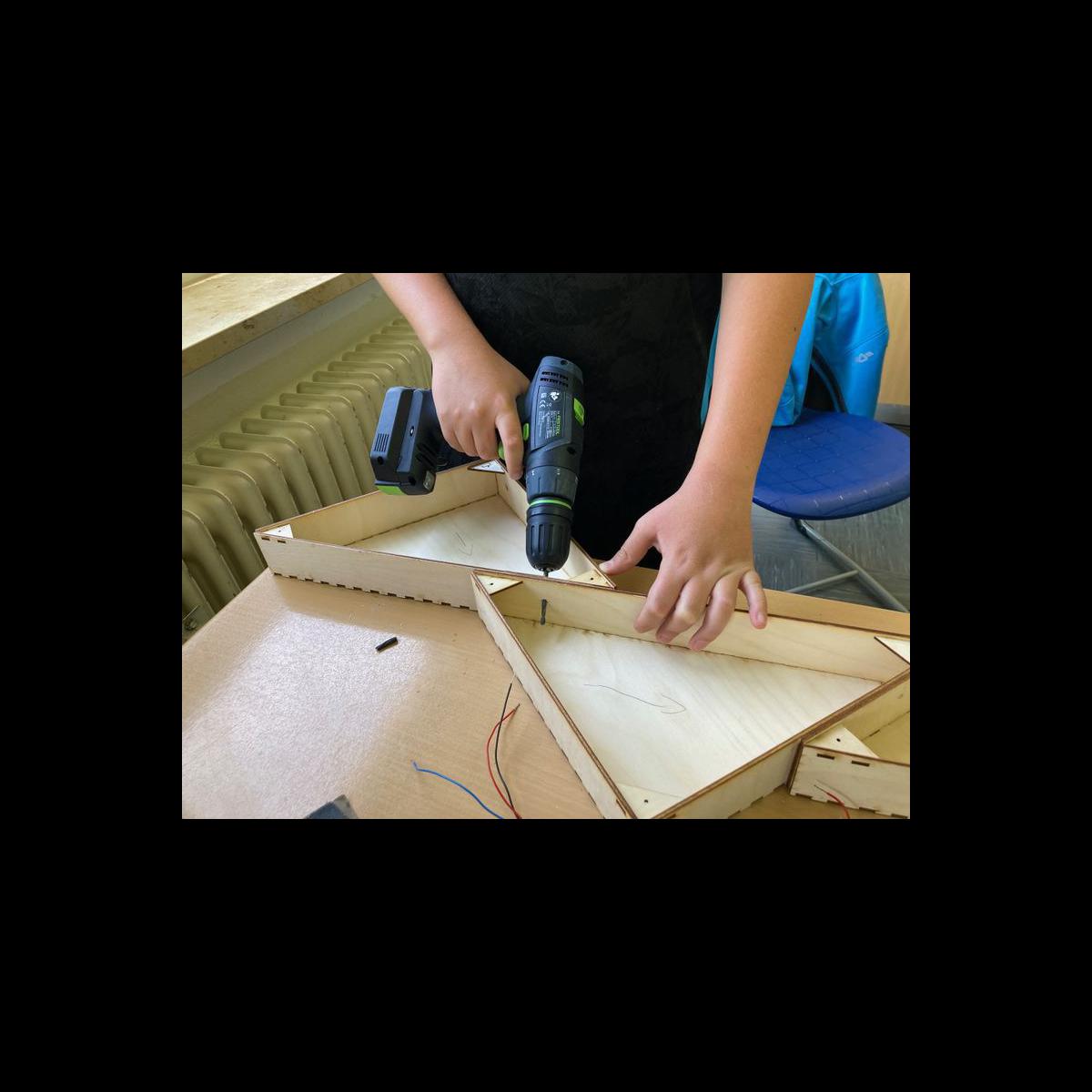 Als erstes baute die Klasse einen Holzrahmen, danach wurde mit Stromkabeln und LED-Stripes ein Stromkreis zusammengelötet. Zum Schluss schraubte jede Schülerin und jeder Schüler milchige Plexiglasscheiben auf die Holzrahmen, dass das Licht der LEDs durchscheinen kann.