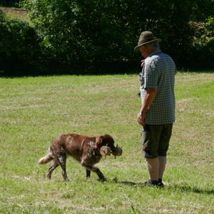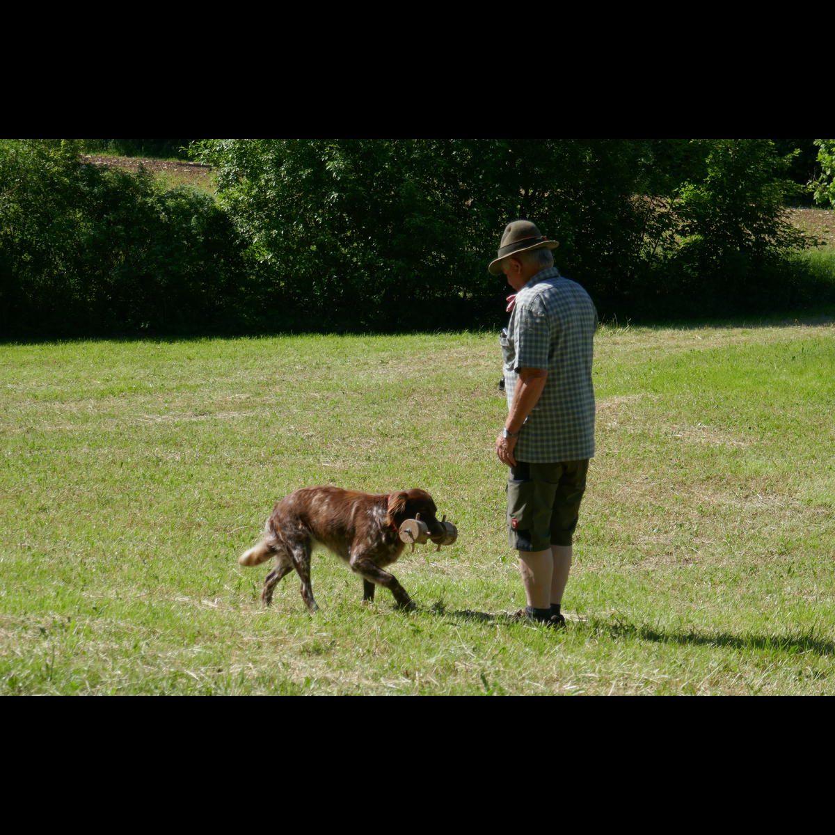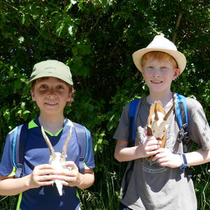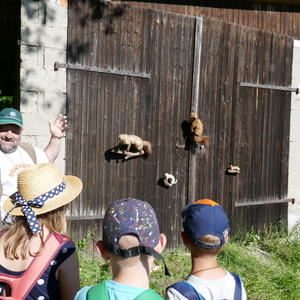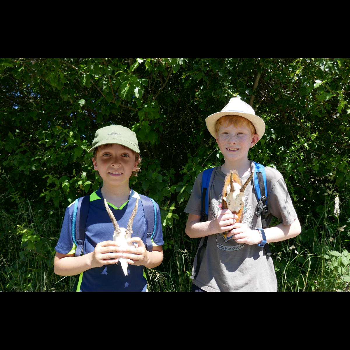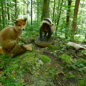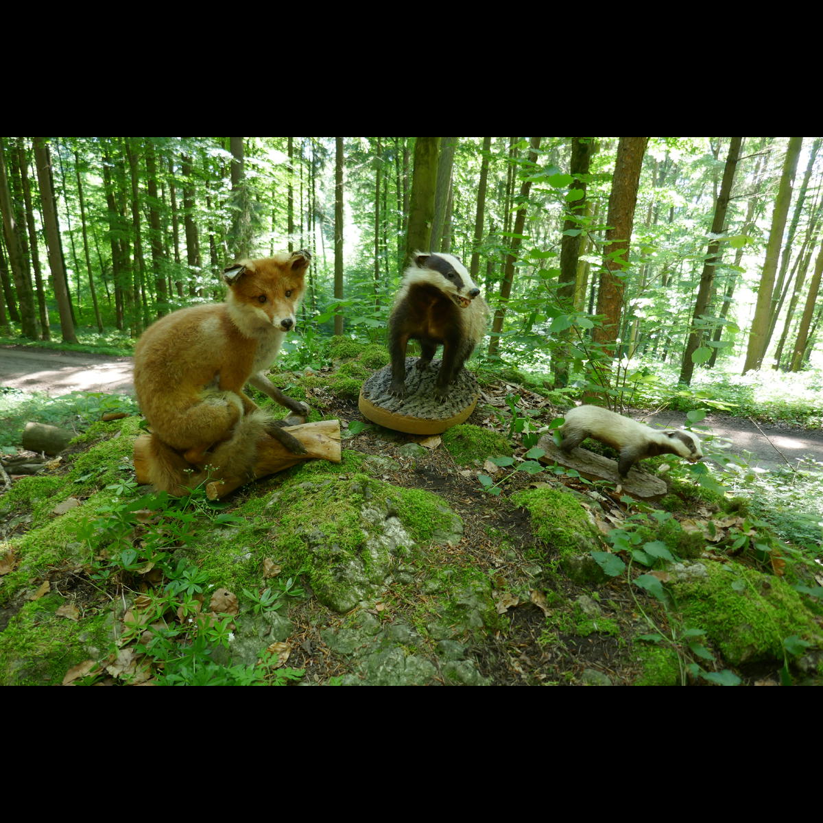 Der Lehrpfad wurde rund um den Schlossberg aufgebaut. Mit den Jagdhunden Ambra und Hexe begaben wir uns auf Spurensuche in den Wald. Wir lernten hier nicht nur das kleinste Raubtier Europas kennen, sondern erfuhren sehr vielüber Greifvögel, Hasen und Kaninchen, über Rehkitze und über Geweihe von Rehböcken. Auf einer Wiese zeigte einer der Jagdhunde sein Können. Wir staunten nicht schlecht, wie gut er hörte! Selbst wenn wir den Apportierknochen versteckten, Hexe lieferte ihn immer verlässlich beim Förster ab.