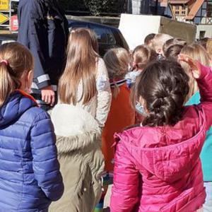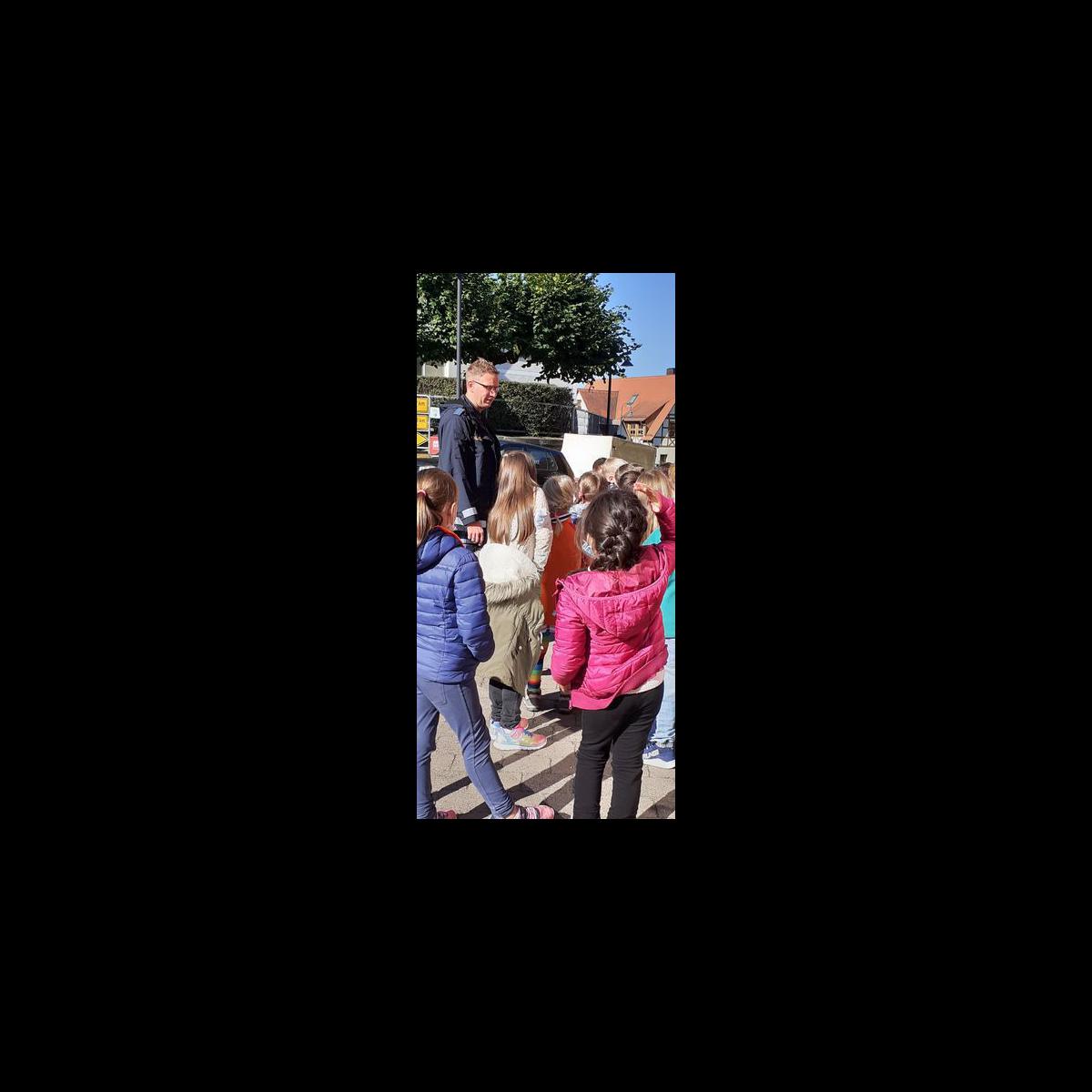 Bei strahlendem Sonnenschein konnte der Verkehrserzieher der Polizei Herr Götz mit den ABC-Schützen die Überquerung der Fahrbahn üben. Die Kinder zeigten sich dabei schon sehr sicher.