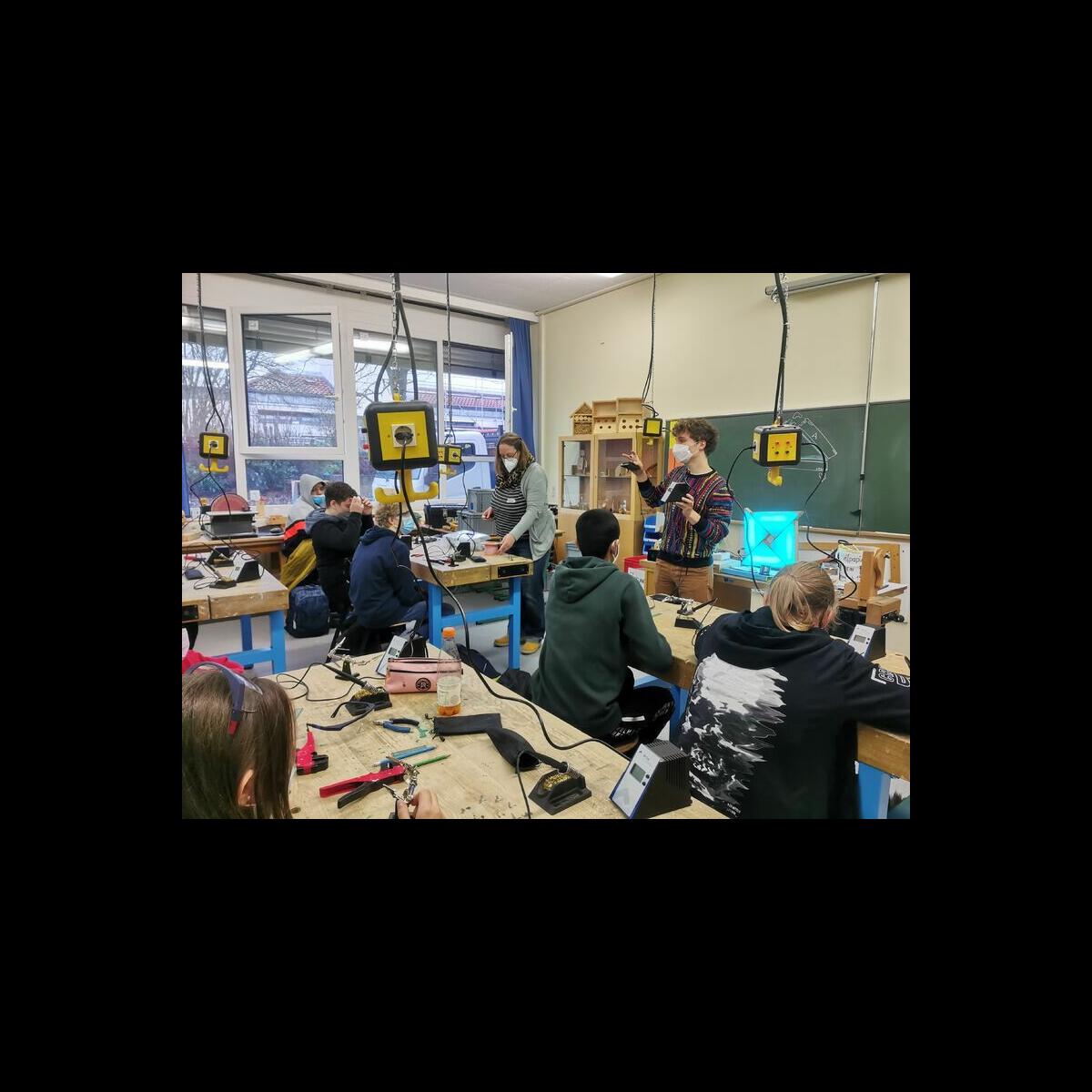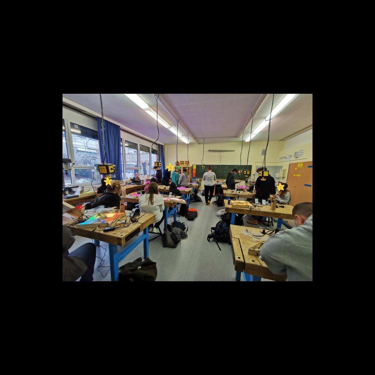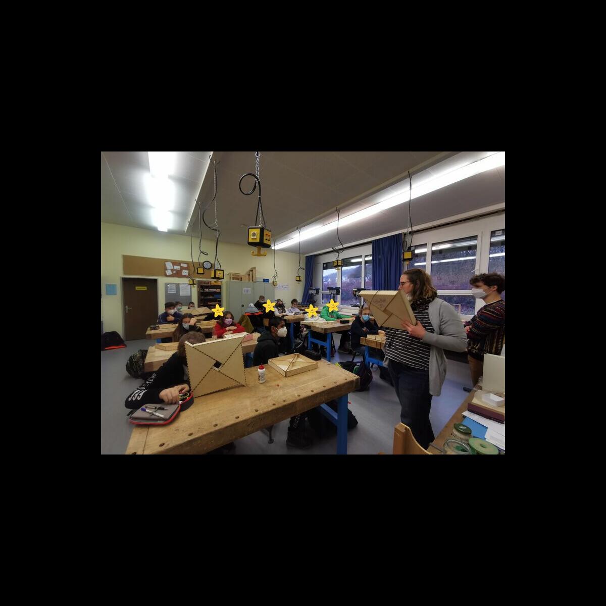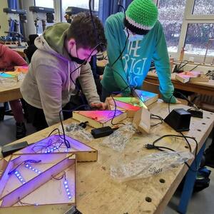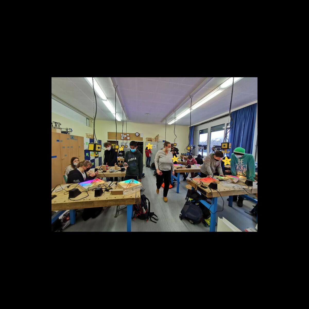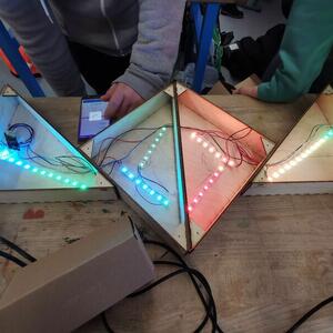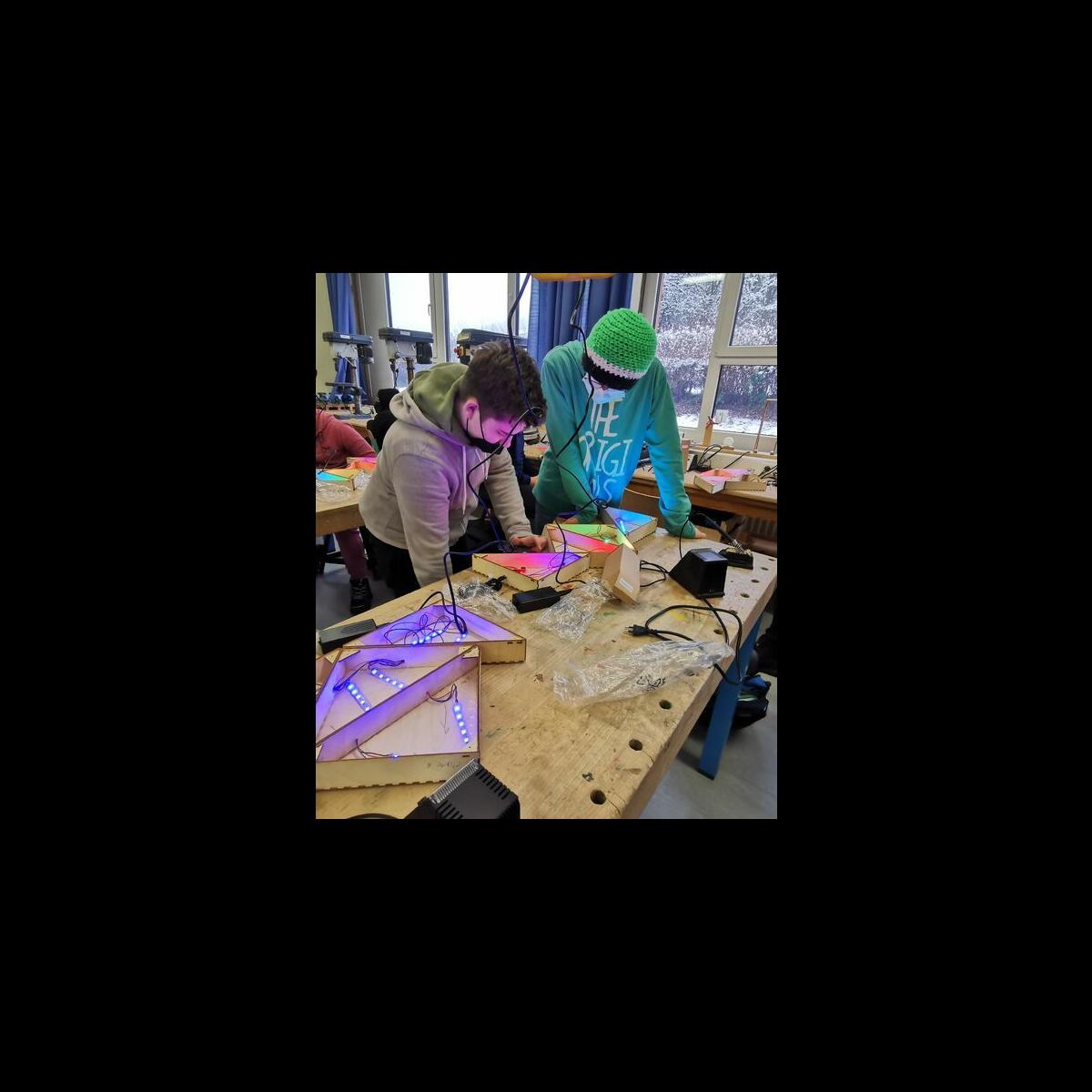 Statt sich ständig mit Mathe, Deutsch und anderen Fächern zu quälen, war praktischer Unterricht angesagt. Unter dem Motto „Praxis an Mittelschulen“ wurden mit der Werkpädagogin Gisa Stich digitale Lichtpanels von den Schülern gebaut. Dabei handelt es sich um kreativ kombinierbare Lichtdreiecke. Hinter einer Plexiglasscheibe stecken LED-Stripes, die digital über eine Handy-App von den Schülern programmiert und gesteuert werden können. Neben handwerklichem Geschick und technischem Verständnis konnten die Schüler in dieser Woche auch ihre Kreativität bei der Verkabelung und der Gestaltung mit einbringen. Das Ergebnis war hervorragend! Cool war, dass nicht nur jeder sein Lichtpanel mit heimnehmen konnte, sondern dass die Klasse sogar einen zusätzlichen Lichtbaustein für ihr Klassenzimmer bauen durfte. So wird der triste Schulalltag mit Sicherheit ein bisschen bunter und dem einen oder anderem ist vielleicht auch ein Licht aufgegangen, welchen Weg er beruflich mal einschlagen will.