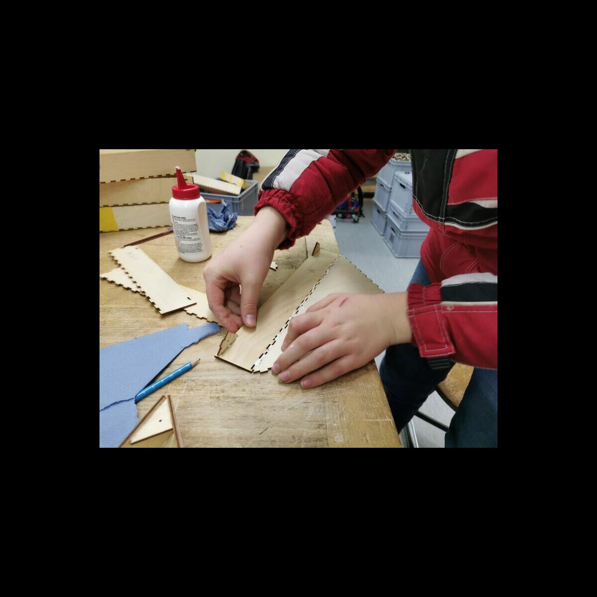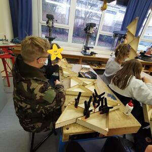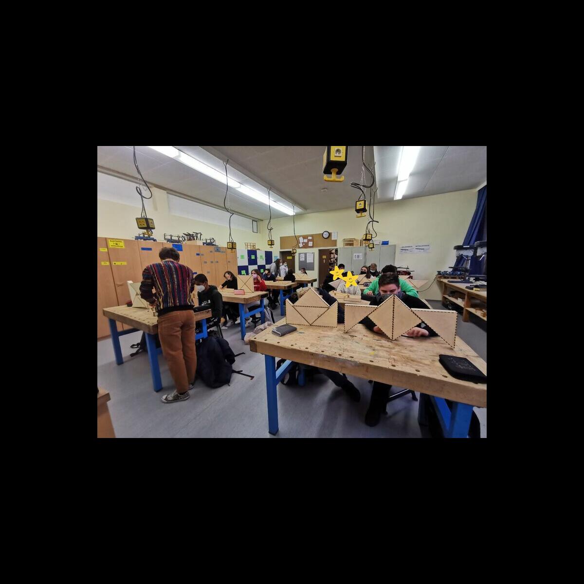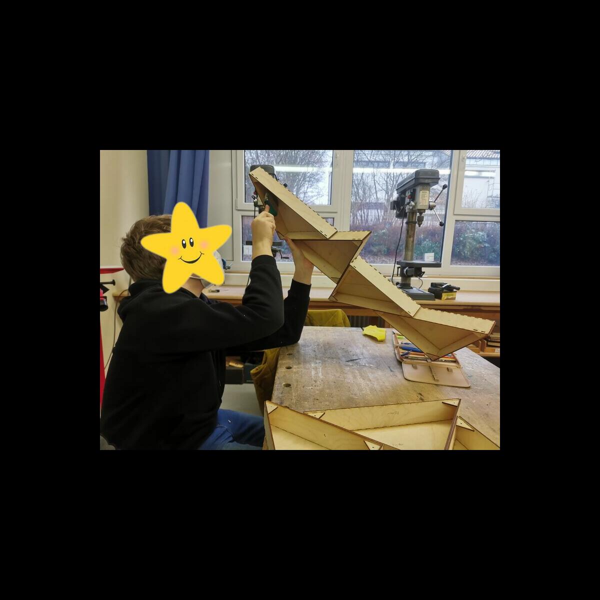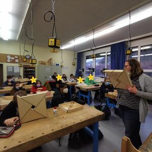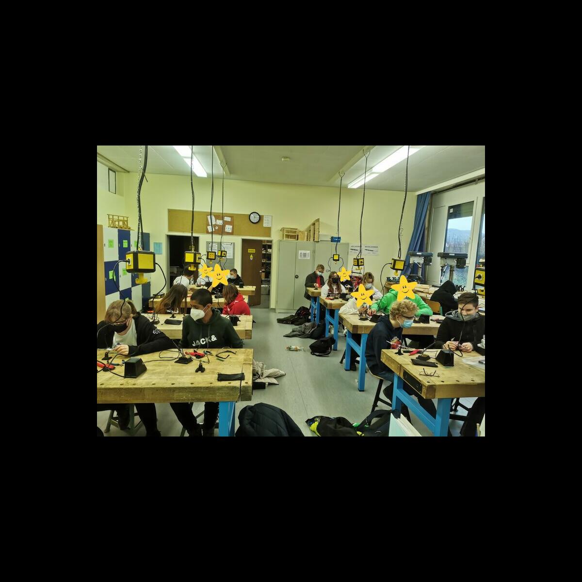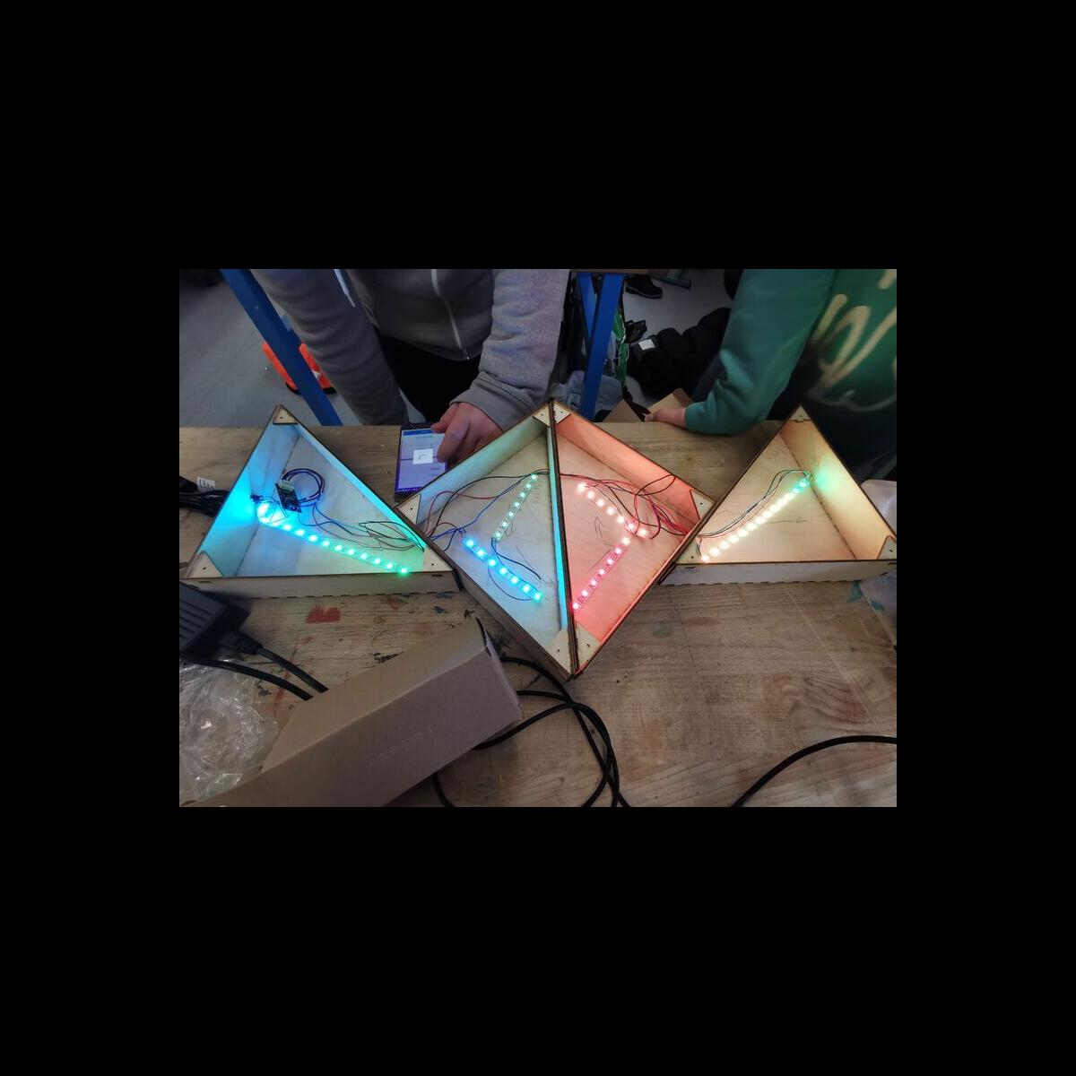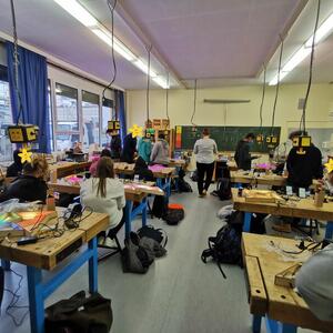 Statt sich ständig mit Mathe, Deutsch und anderen Fächern zu quälen, war praktischer Unterricht angesagt. Unter dem Motto „Praxis an Mittelschulen“ wurden mit der Werkpädagogin Gisa Stich digitale Lichtpanels von den Schülern gebaut. Dabei handelt es sich um kreativ kombinierbare Lichtdreiecke. Hinter einer Plexiglasscheibe stecken LED-Stripes, die digital über eine Handy-App von den Schülern programmiert und gesteuert werden können. Neben handwerklichem Geschick und technischem Verständnis konnten die Schüler in dieser Woche auch ihre Kreativität bei der Verkabelung und der Gestaltung mit einbringen. Das Ergebnis war hervorragend! Cool war, dass nicht nur jeder sein Lichtpanel mit heimnehmen konnte, sondern dass die Klasse sogar einen zusätzlichen Lichtbaustein für ihr Klassenzimmer bauen durfte. So wird der triste Schulalltag mit Sicherheit ein bisschen bunter und dem einen oder anderem ist vielleicht auch ein Licht aufgegangen, welchen Weg er beruflich mal einschlagen will.