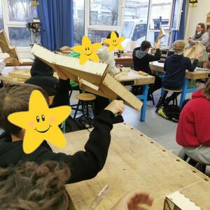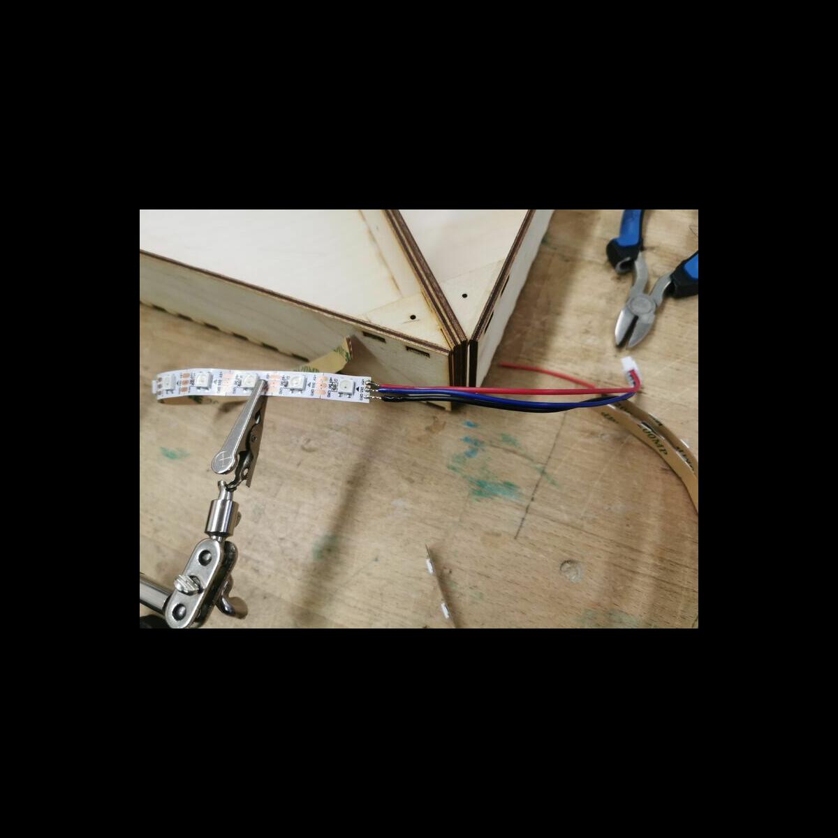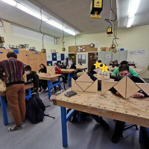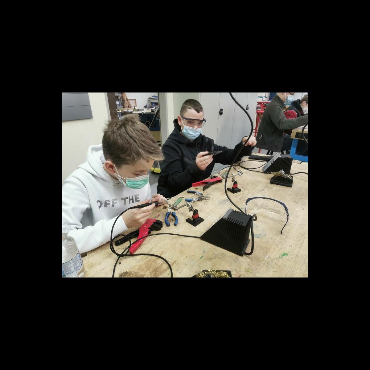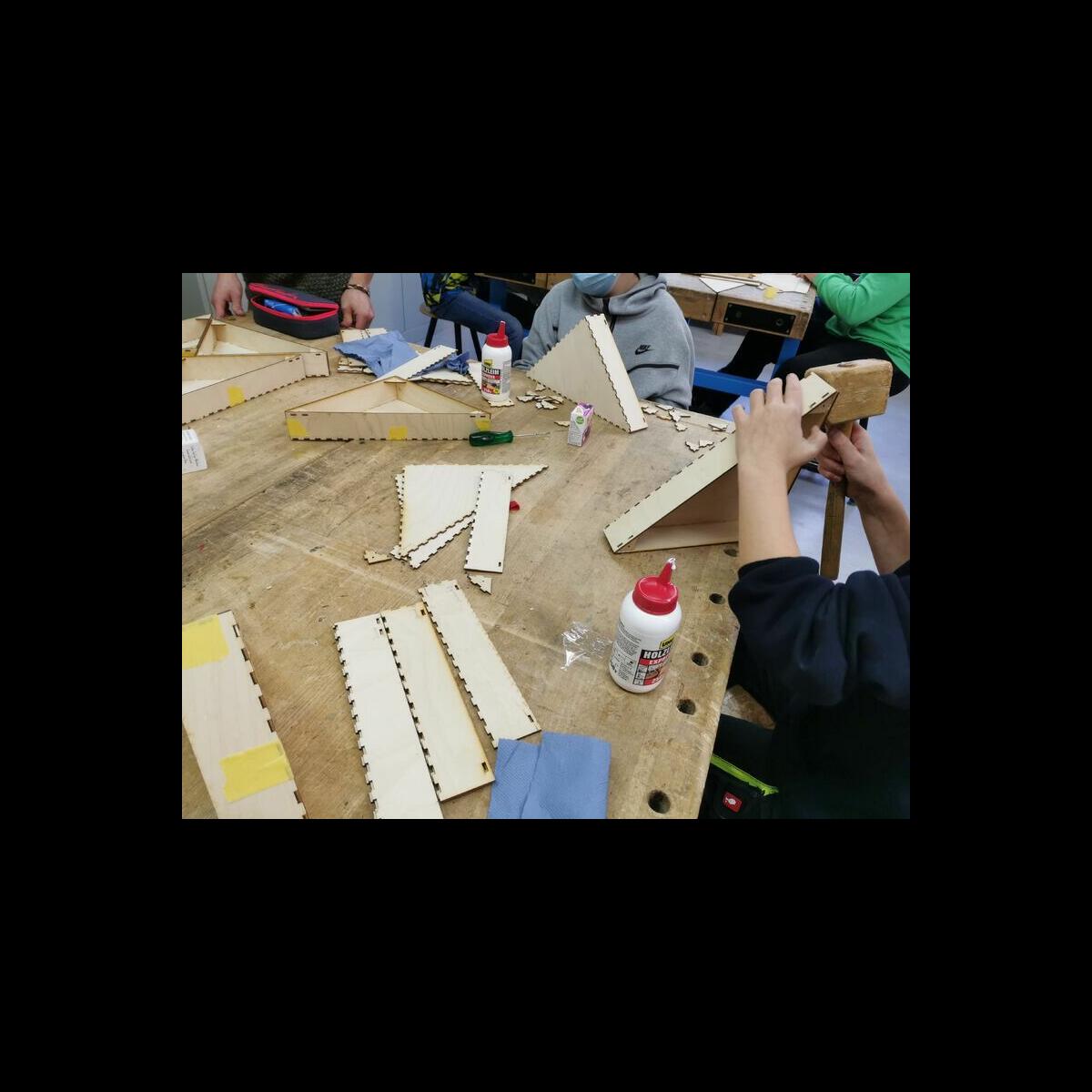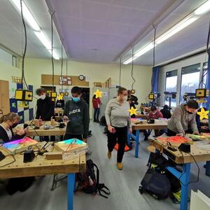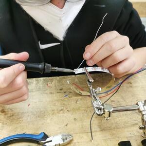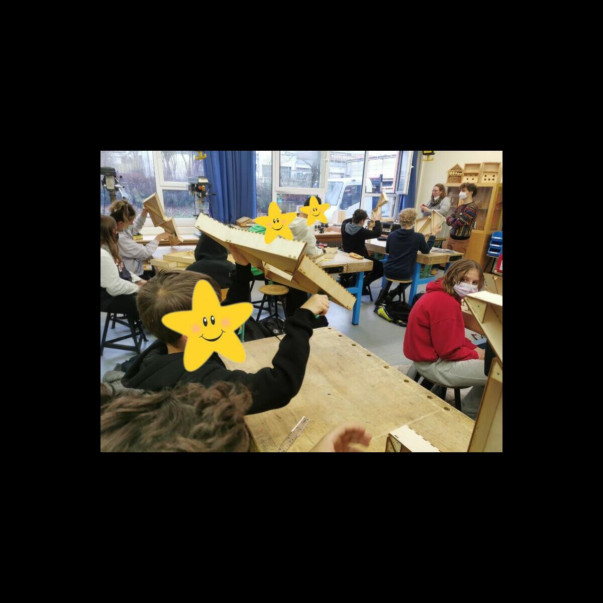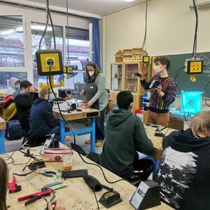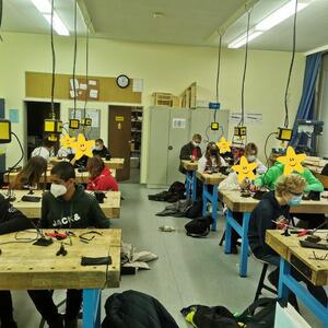 Statt sich ständig mit Mathe, Deutsch und anderen Fächern zu quälen, war praktischer Unterricht angesagt. Unter dem Motto „Praxis an Mittelschulen“ wurden mit der Werkpädagogin Gisa Stich digitale Lichtpanels von den Schülern gebaut. Dabei handelt es sich um kreativ kombinierbare Lichtdreiecke. Hinter einer Plexiglasscheibe stecken LED-Stripes, die digital über eine Handy-App von den Schülern programmiert und gesteuert werden können. Neben handwerklichem Geschick und technischem Verständnis konnten die Schüler in dieser Woche auch ihre Kreativität bei der Verkabelung und der Gestaltung mit einbringen. Das Ergebnis war hervorragend! Cool war, dass nicht nur jeder sein Lichtpanel mit heimnehmen konnte, sondern dass die Klasse sogar einen zusätzlichen Lichtbaustein für ihr Klassenzimmer bauen durfte. So wird der triste Schulalltag mit Sicherheit ein bisschen bunter und dem einen oder anderem ist vielleicht auch ein Licht aufgegangen, welchen Weg er beruflich mal einschlagen will.