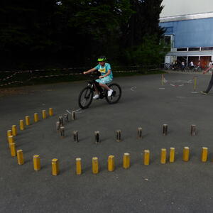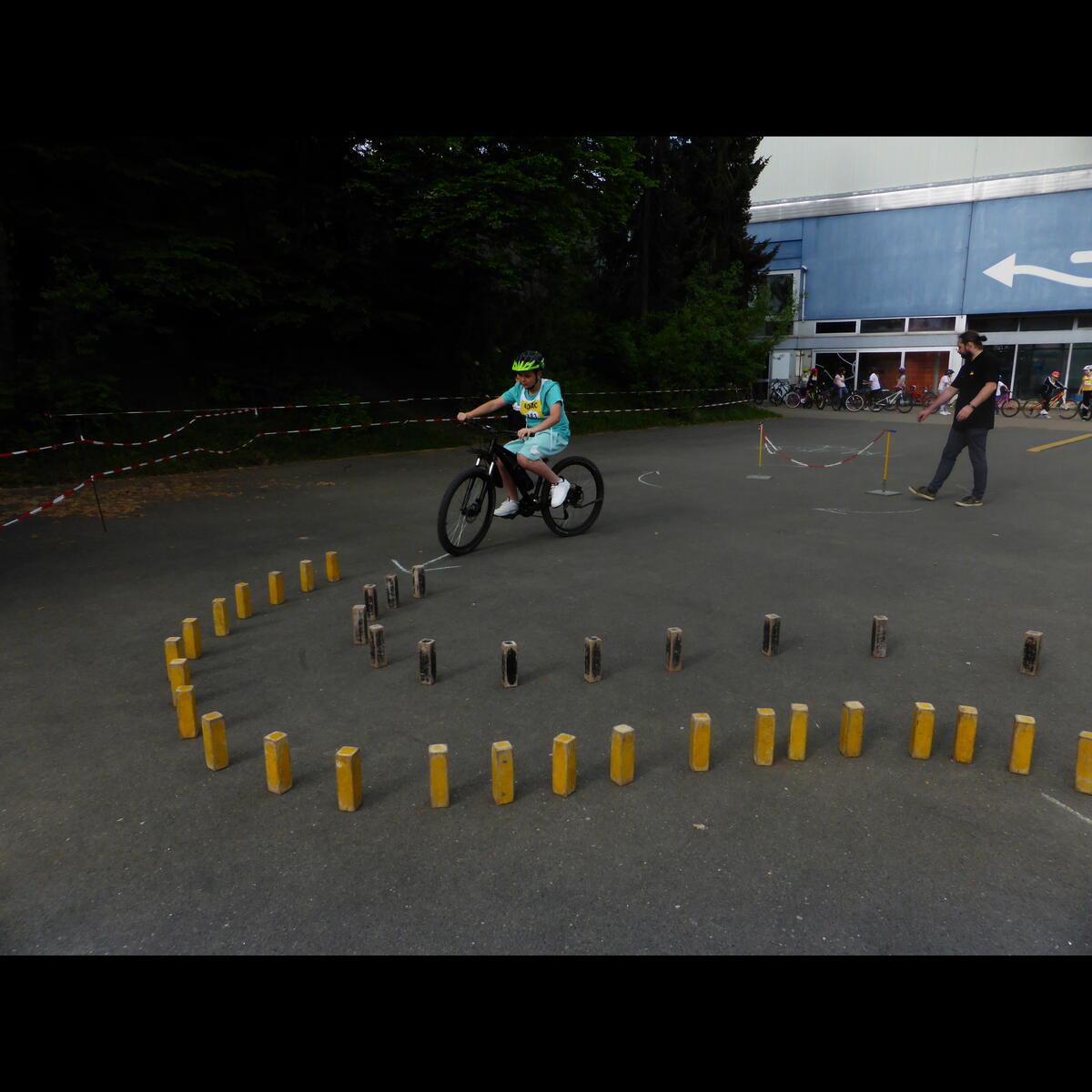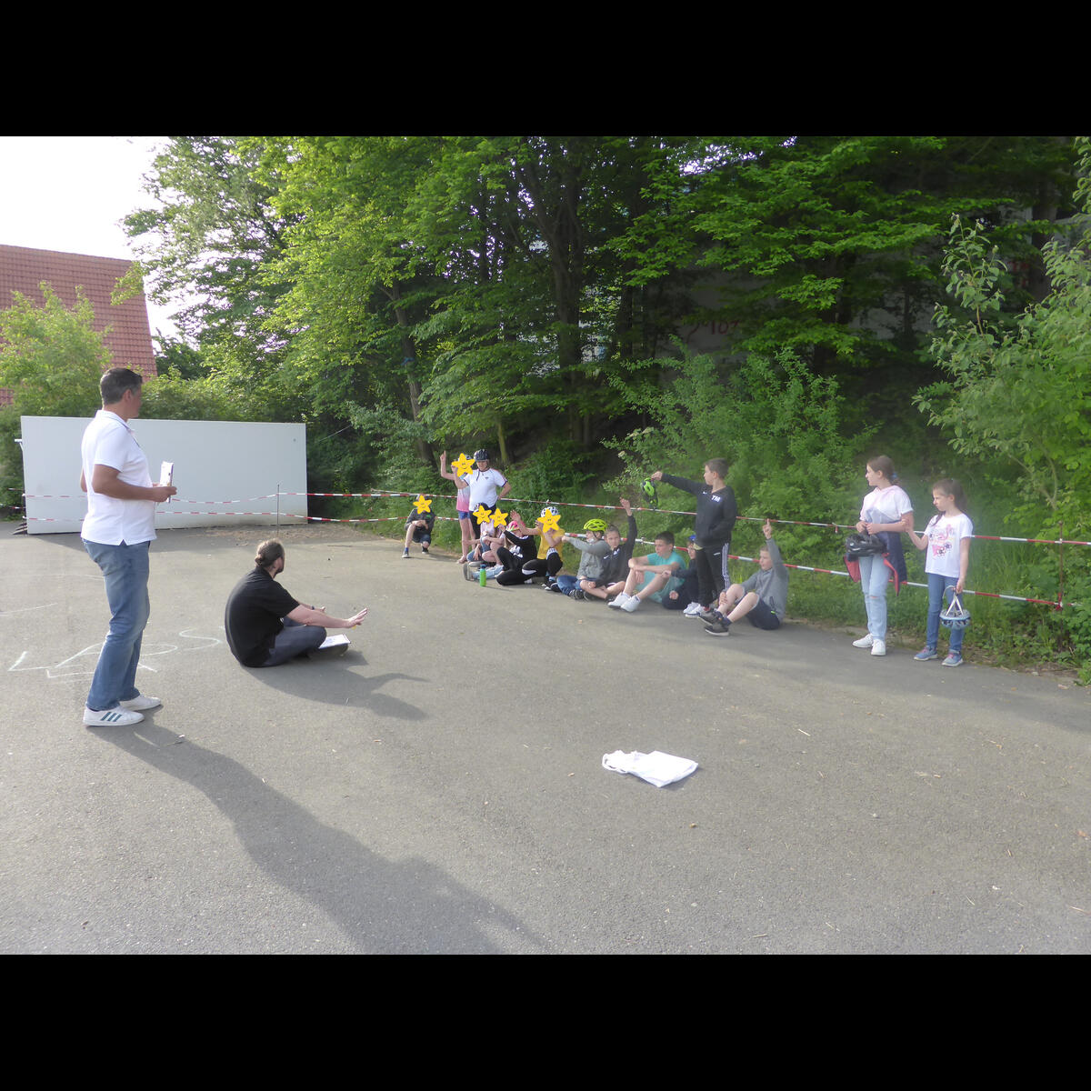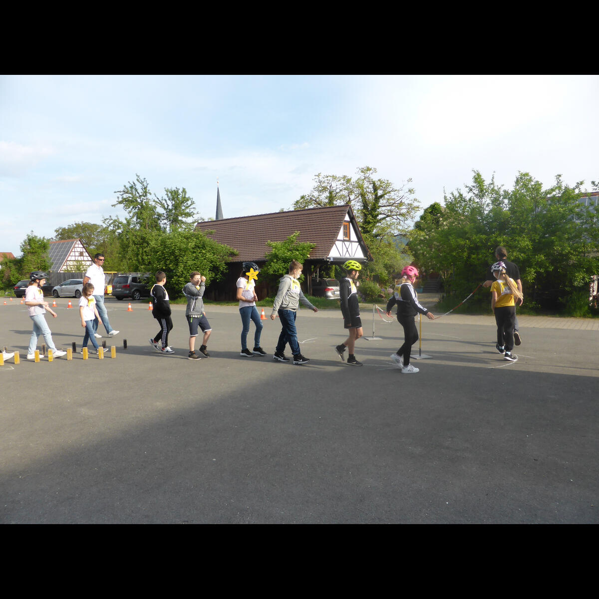 Zuerst bauten der ADAC einen Hindernisparkour für die Schüler aus. Die Kinder hatten meist eigene Fahrräder dabei, die zunächst auf die Verkehrssicherheit kontrolliert wurden. Zusätzlich stellte der Hausmeister noch schuleigene Fahrräder zur Verfügung. Dann wurde der Parkour vorgestellt. So mussten die Schüler mit dem Fahrrad auf einem schmalen Brett balancieren und einhändig Kreisel links und rechts herum fahren. Slalom, Handzeichen geben, Spurwechsel sowie eine
