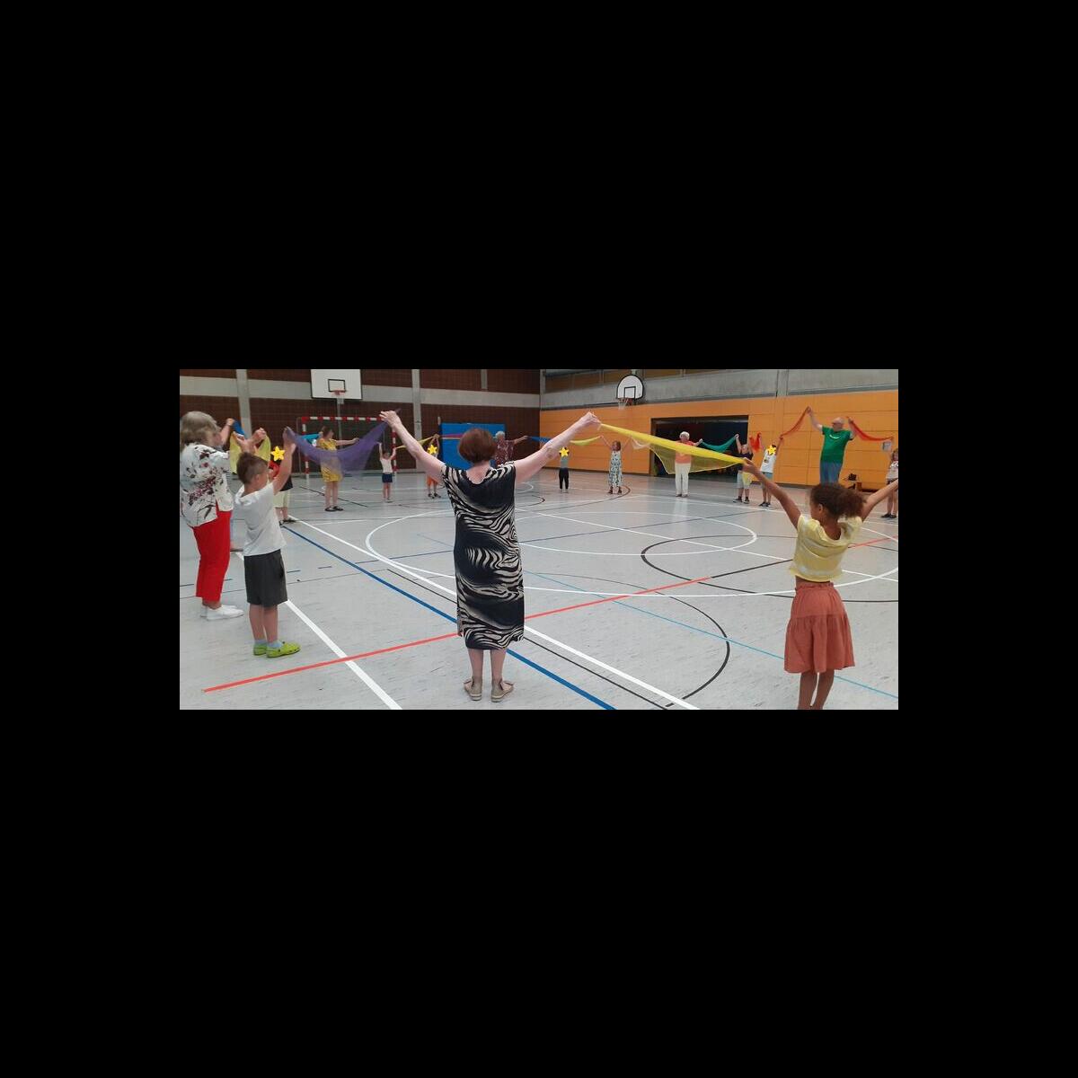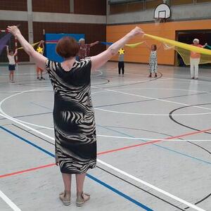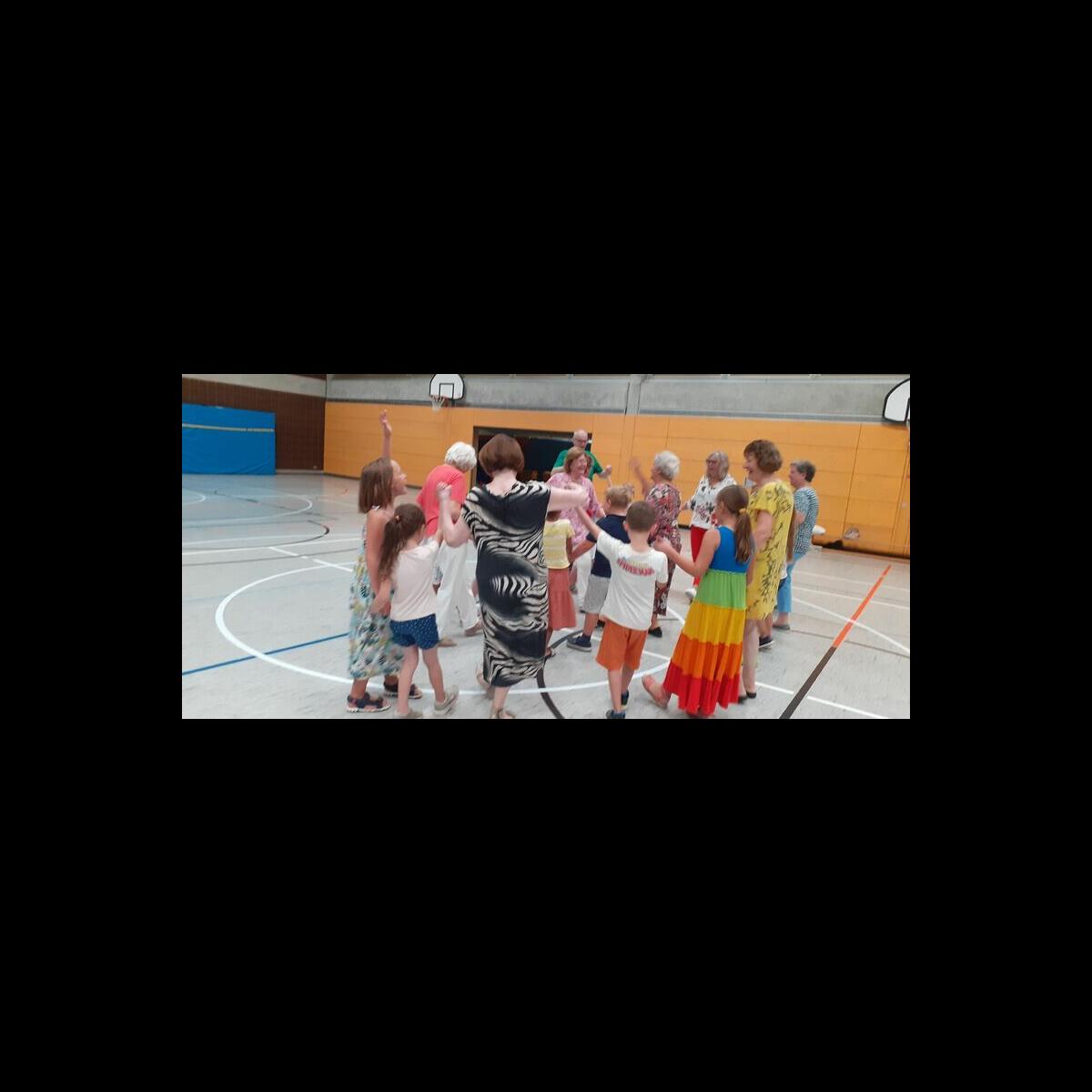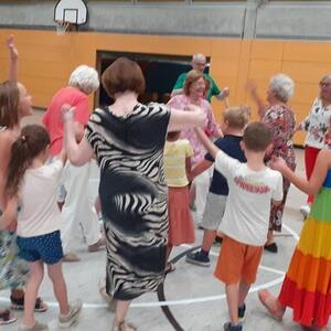 Nach einem gemeinsamen Begrüßungstanz zeigten die Erstklässer den Senioren ihren "Robinson-Tanz" (Krebspolka). Danach wurden noch zwei Tänze der Senioren erlernt. Besonderen Spaß bereitete den Schülern ein Tanz mit Tüchern und die Annenpolka, bei der die Kinder ganz laut "Hey" rufen durften.