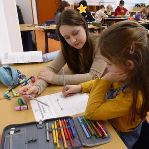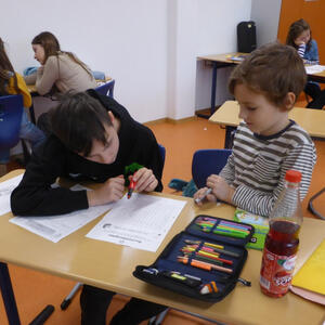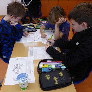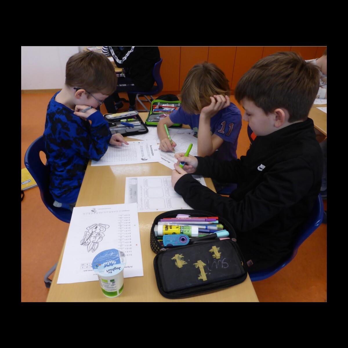 Die Kinder lasen Geschichten über den Osterhasen, malten passend die Bilder dazu, rechneten oder suchten Wörter, die mit Ostern zu tun haben in einem riesigen Buchstabenfeld zusammen. Die „Großen“ unterstützten die Erstklässler beim Lesen und lernten auch jede Menge dazu, z. B. wie man ein Küken malt.