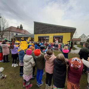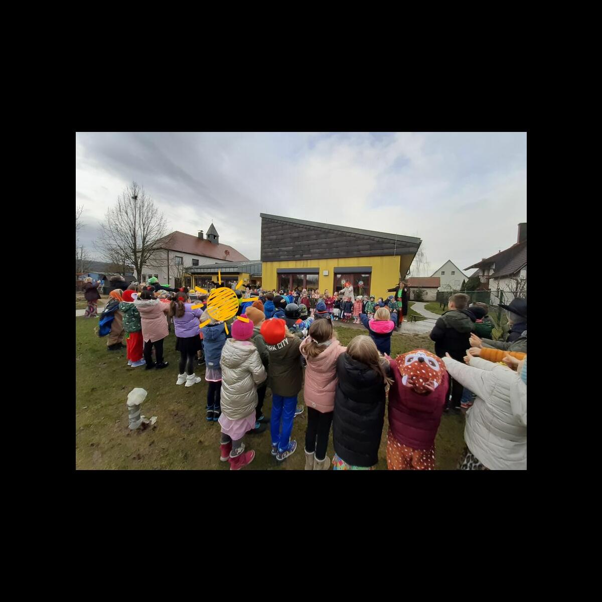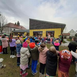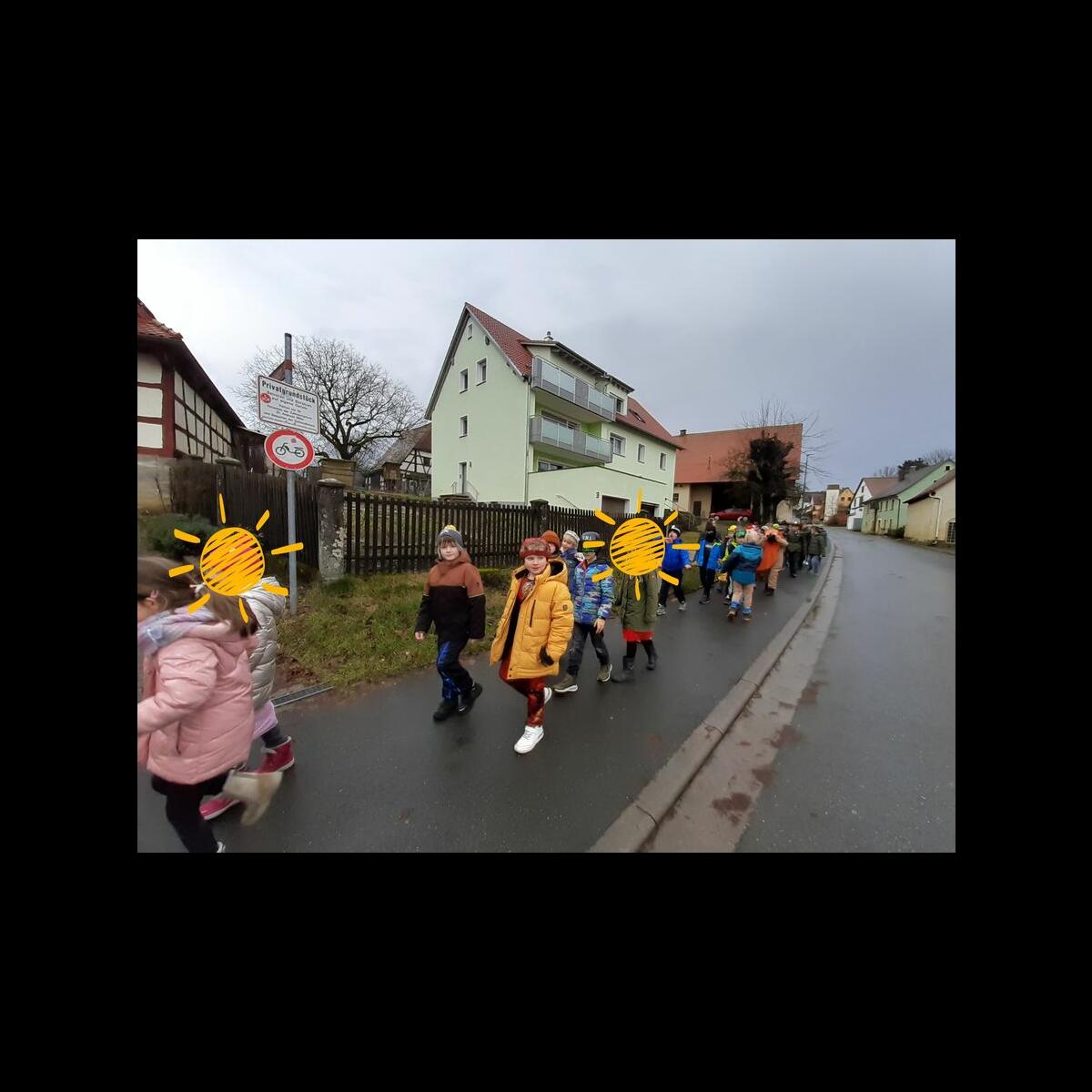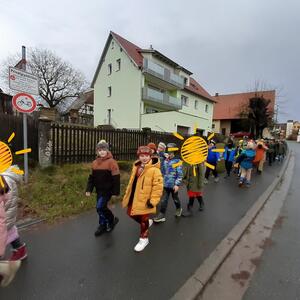 Die Grundschule marschiert in einem Umzug durch Kirchehrenbach und macht beim Kindergarten Halt.