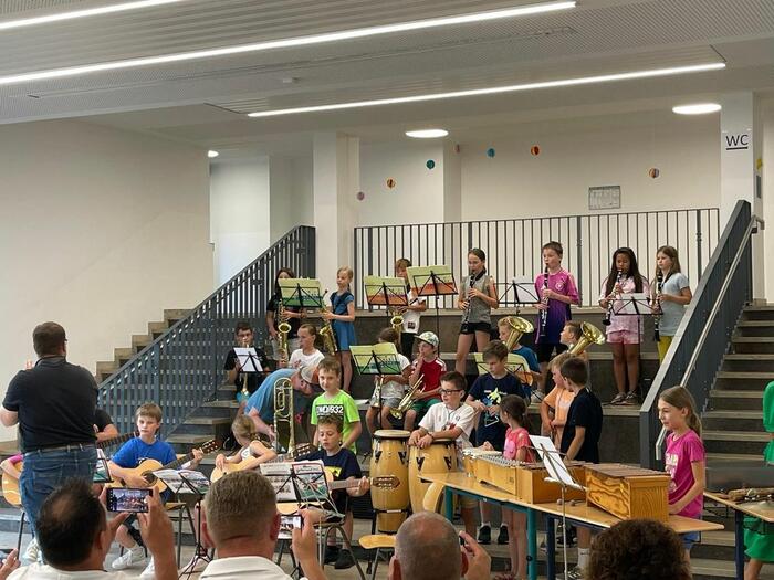 In der gut besuchten Aula konnten die Gäste hören, was die Jeki-Schüler der 3. und 4. Klassen im vergangenen Jahr gelernt hatten. Zuerst zeigten die Orffschüler, Gitarristen, Holz- und Blechbläser in ihren jeweiligen Gruppen mit ihren Lehrern Manuel Trautner, Johannes Raum, Manuela Hofmann, Ingo Kürten ihr Können, bevor zum Abschluss alle zusammen "Major Tom" spielten.