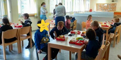Mit Unterstützung einiger Eltern konnten die Kinder der 1. Klasse ihre "Lunchibox" bei einem gemeinsamen Frühstück in Empfang nehmen. Mit großem Appetit verzehrten die Schüler den gesunden Inhalt der Dose.